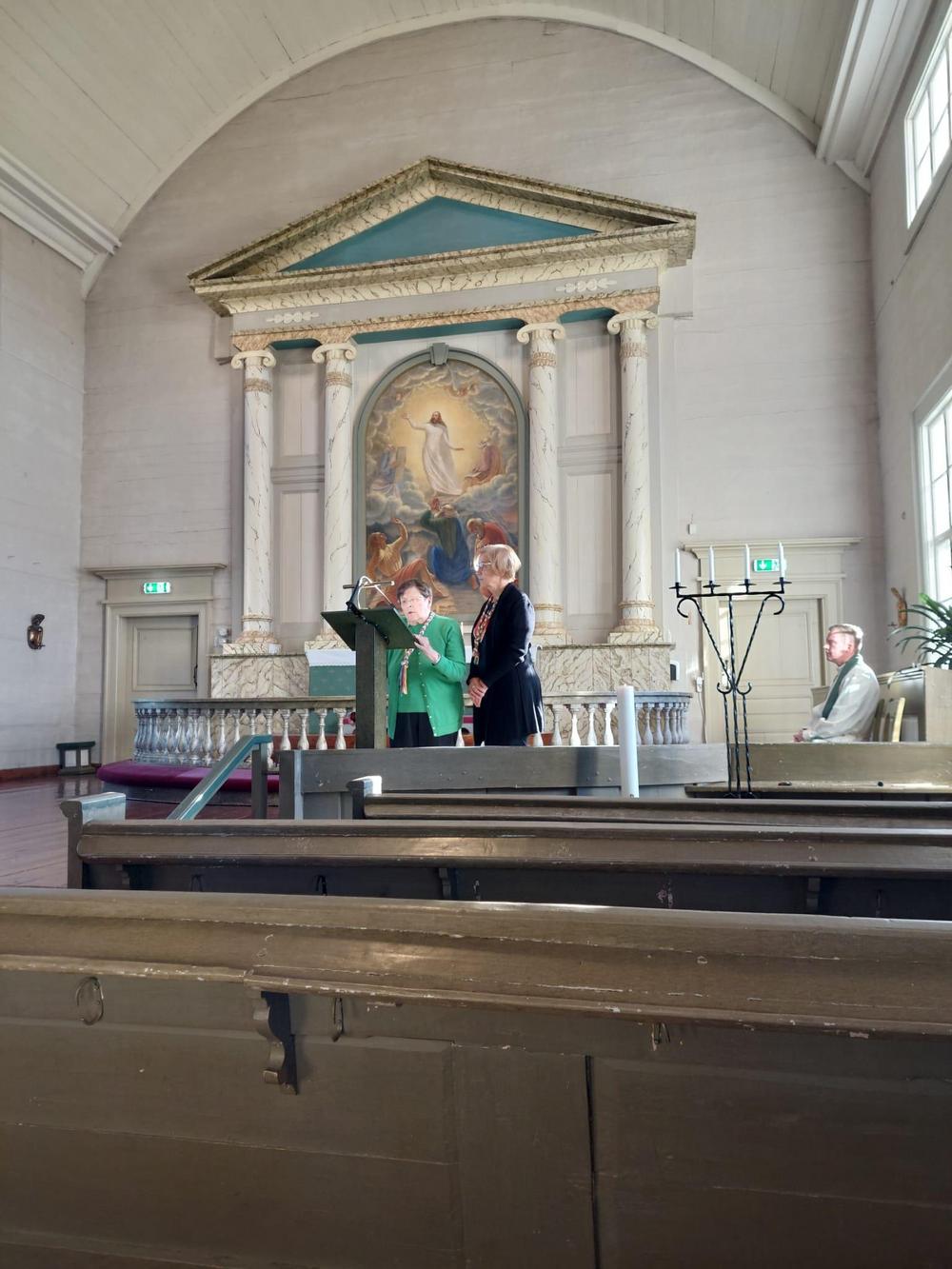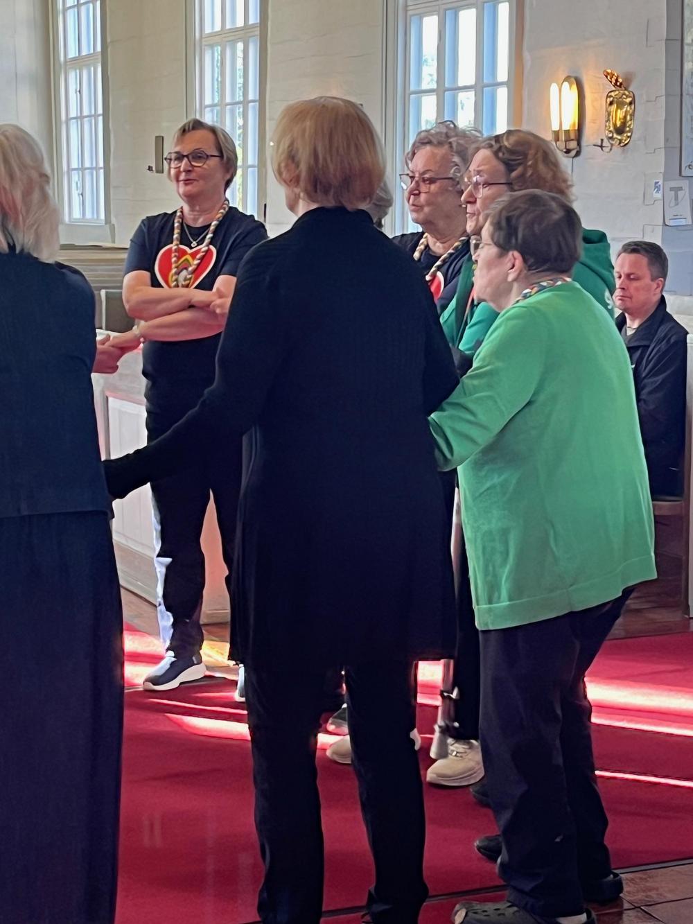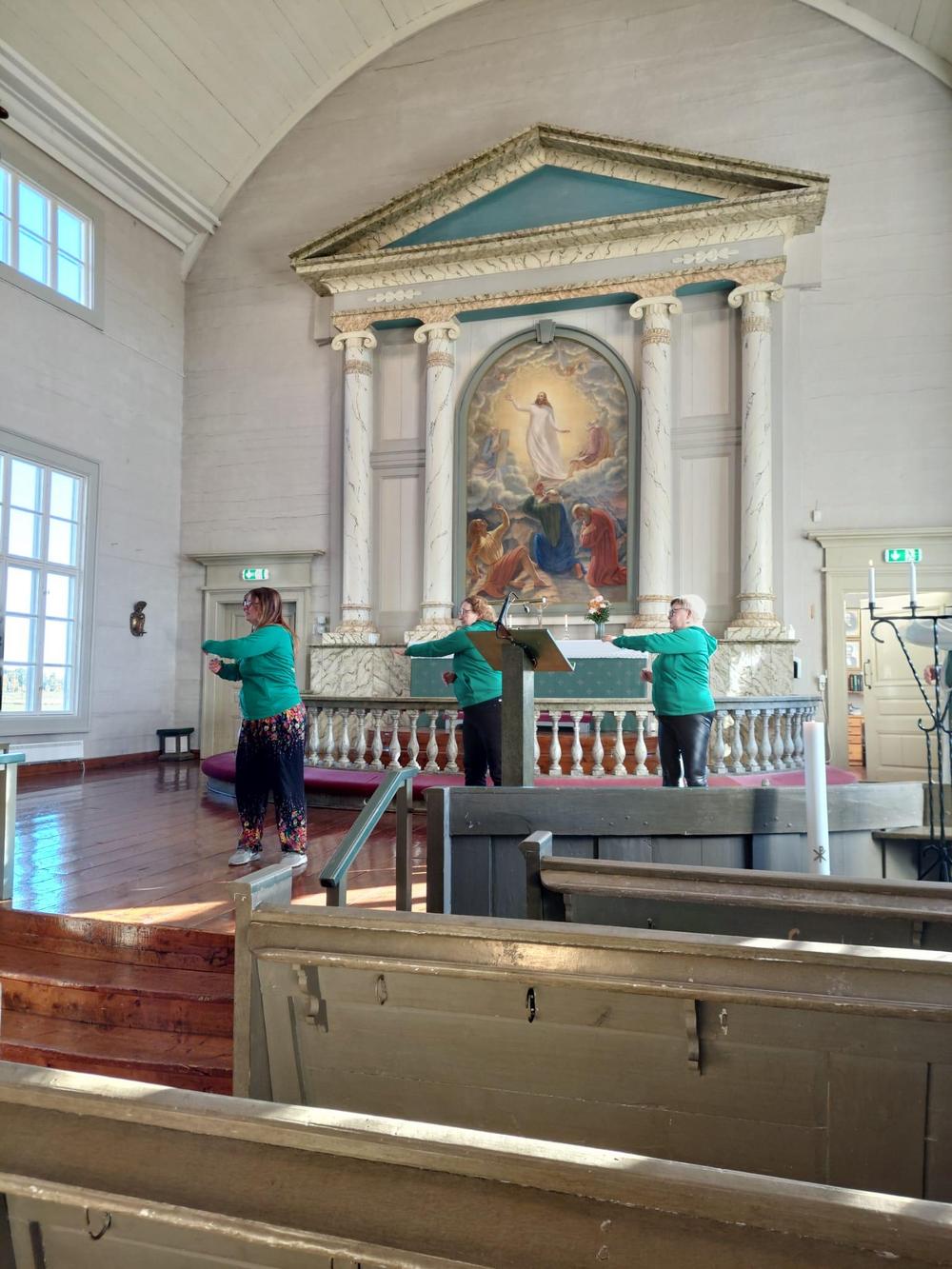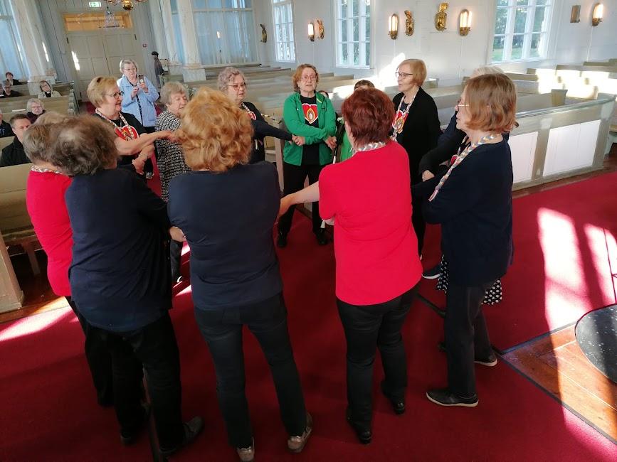 Teemana oli liikunnallinen kirkkopyhä. Ohjattu taukojumppa toteutettiin ja tietenkin hyvät kirkkokahvit tarjottiin. Limingan Naisvoimistelijoiden Uskollisuuden Killan edustajat olivat mukana toteuttamassa tapahtumaa. Killan edustajat muodostivat ystäväpiirin ennen kahvituksen alkamista.