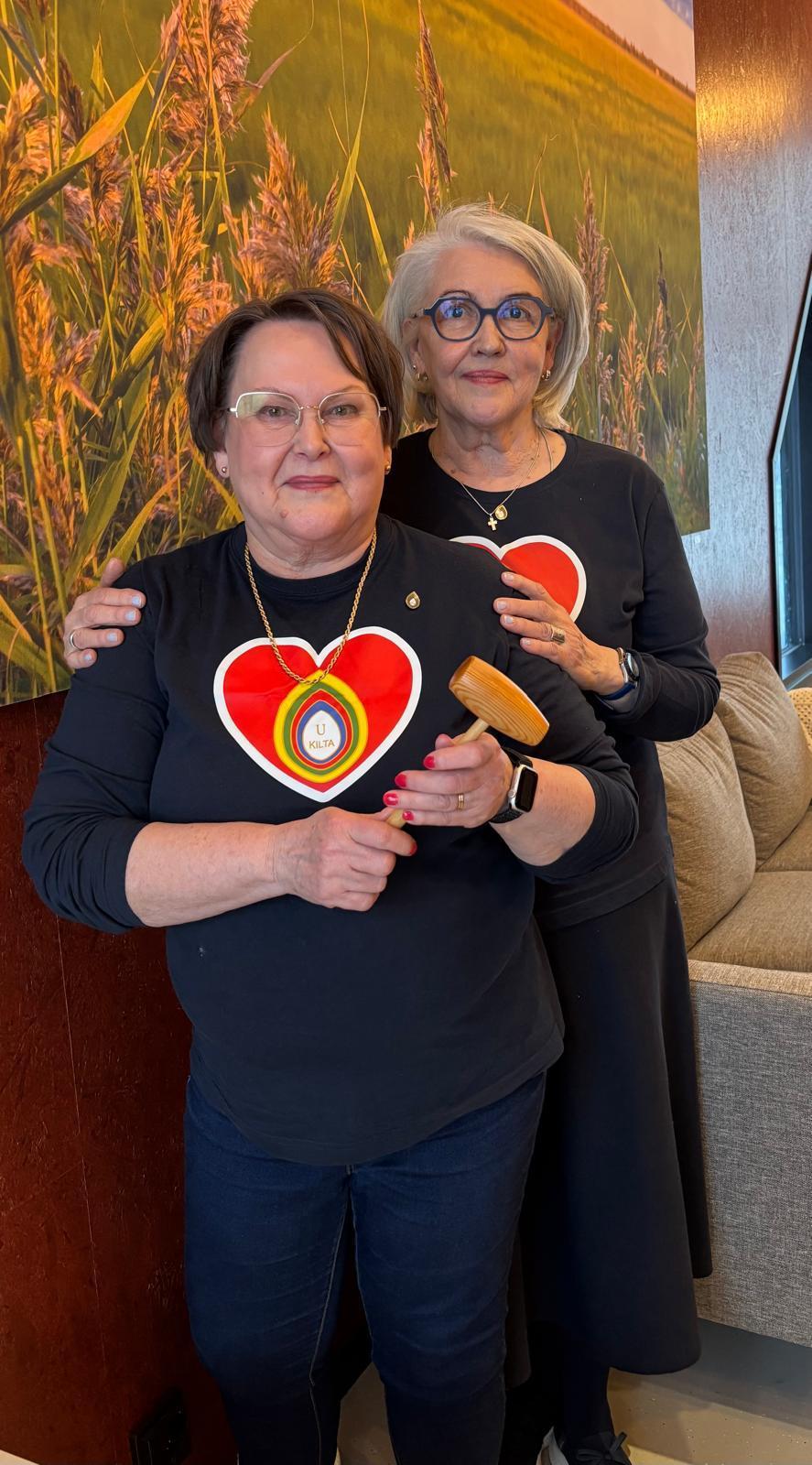 Kuva: Kiltaäidit tehtävän vaihdossa vuosikokouksessa. Edessä Liisa Mettovaara ja takana Leila Mäkikyrö. Kuvaaja Oili Martikkala.