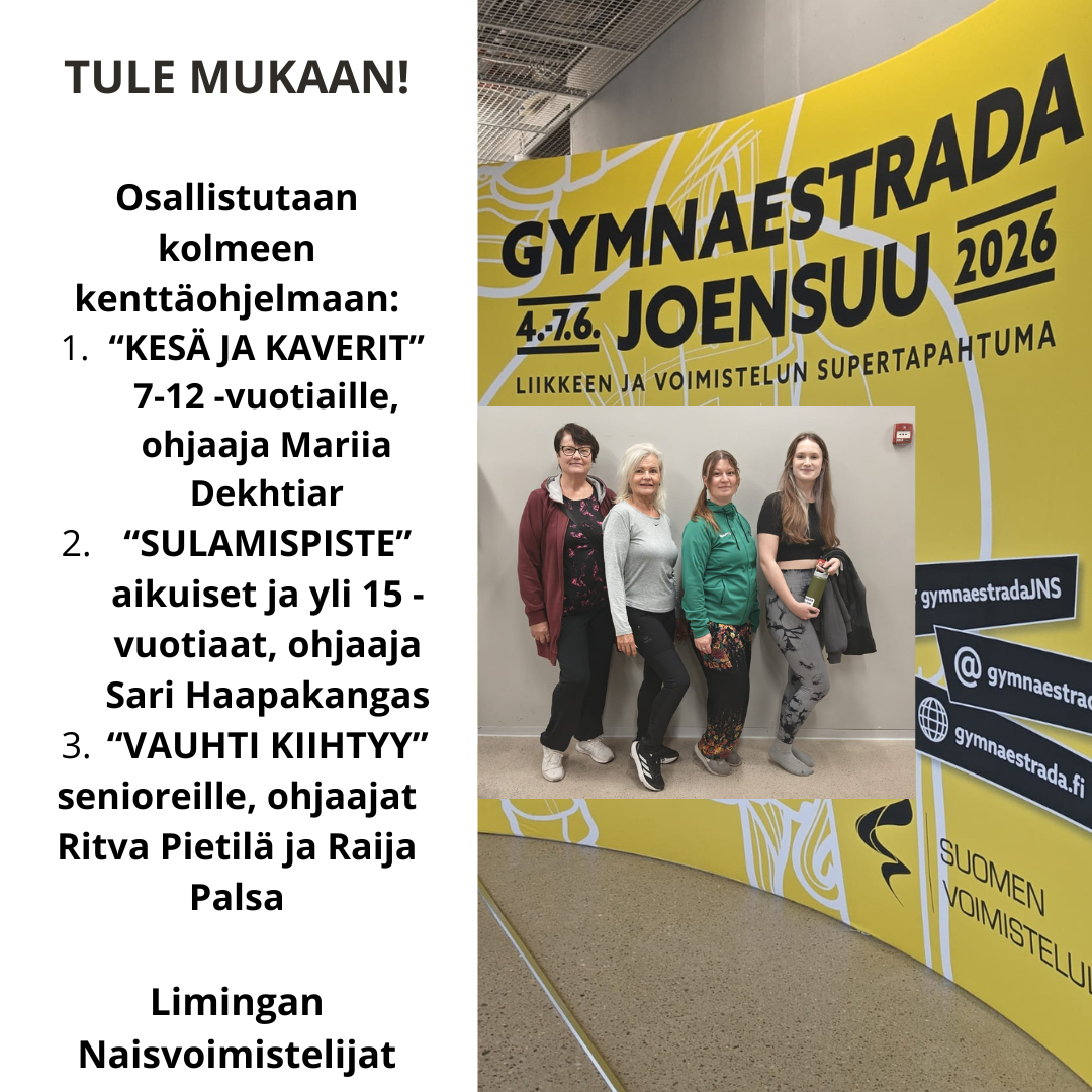 Joensuussa 4.-7.6.2026 järjestettävä Gymnaestrada on täynnä tapahtumaa niin osallistujille, katsojille kuin kokeilijoillekin. Tapahtumapäivien aikana luvassa on luvassa näytöksiä, kilpailuja, kenttäohjelmia, kokeilupisteitä sekä liikkumisen riemua monessa muodossa. Paikalle saapuvat tuhannet voimistelijat ympäri Suomen!