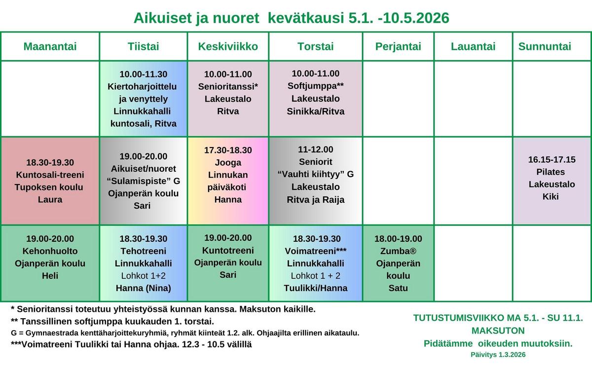 Aikuisten ja nuorten ryhmissä on aina tilaa. LNV hiihtoloma on su 1.3. - la 7.3.2026, jolloin ei ole jumppia. Arkipyhien aattoina ei yleensä ole jumppia, ellei toisin ilmoiteta. 30.4. ja 1.5. ei ole jumppia.
